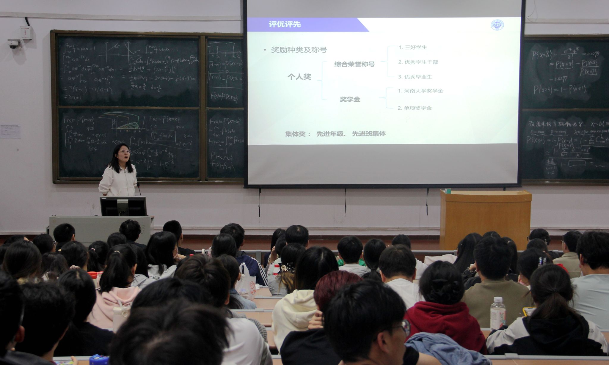 奖学金等各类奖学金的申请要求和奖励方法,并借此鼓励学生们学习先进,勇争上游,努力取得属于自己的奖励与荣誉。最后,屈利铭总结了上一学年以及学生近期的学习生活情况,鼓励学生们努力学习,把握大二学年这一关键阶段,积极参与实践活动与专业竞赛,促进自身全面发展,在未来的大学生活中书写自己的华丽篇章。