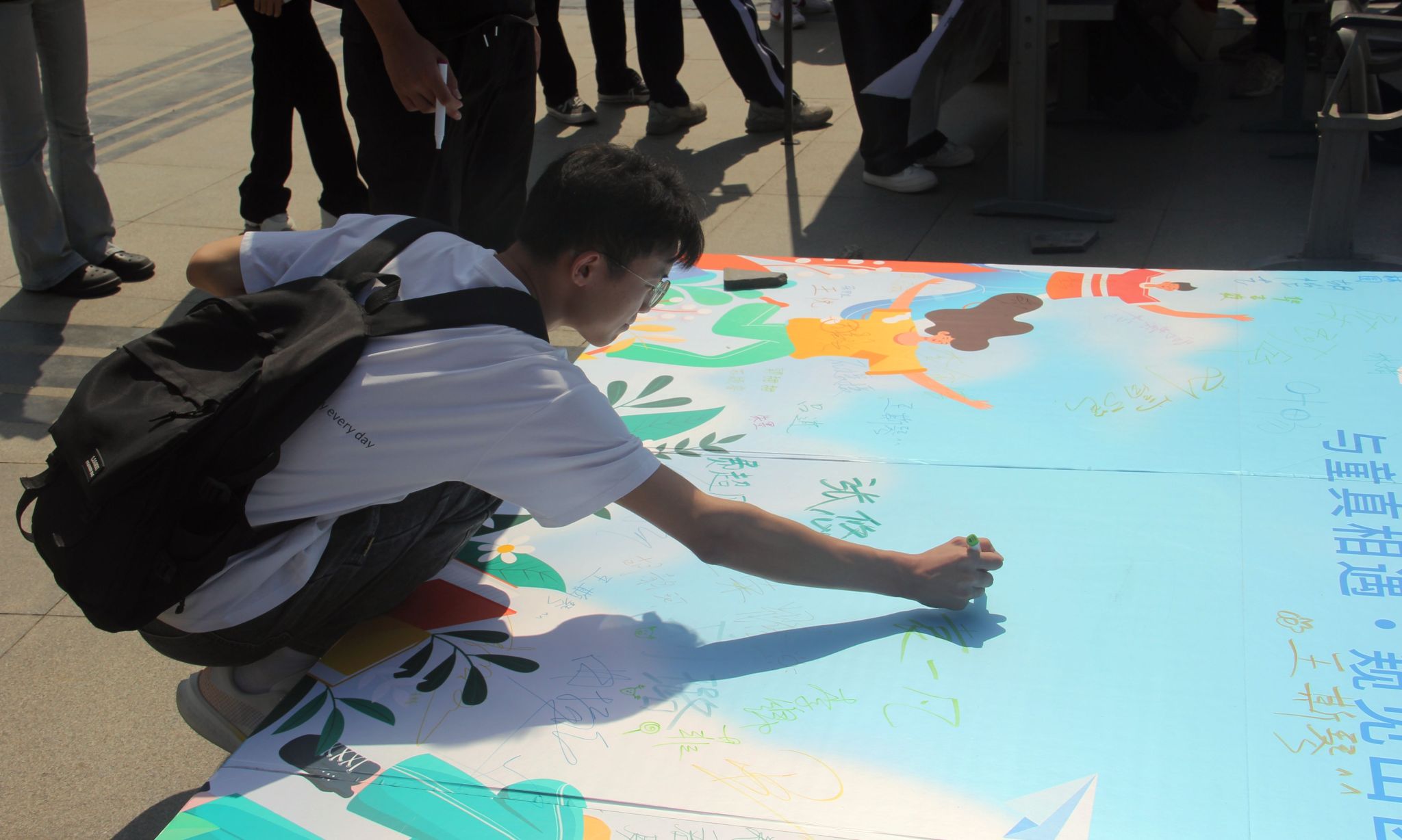专属定制明信片上写下对困境儿童的鼓励与祝愿,用文字传递希望与关怀。“‘善良的心灵并非漫山遍野,但也如点点繁星照亮黑夜’,愿你的未来璀璨而又明亮”,一位参与者在明信片中深情留言并附上了生动的手绘画。寥寥几笔,看似微不足道,却最温暖人心,每张小小的明信片汇集着来自五湖四海的力量,传递着直抵人心的真诚与善良。学生们也在希望树展板上留下了自己的色彩,他们用手印装点,用真情刻画,终使叶密成树,希望成花。最后,参与学生纷纷在展板上签名并进行开学季举牌打卡,他们希望能尽自己绵薄之力,为孩子们播种希望,用爱心与真情开启新的学期。
