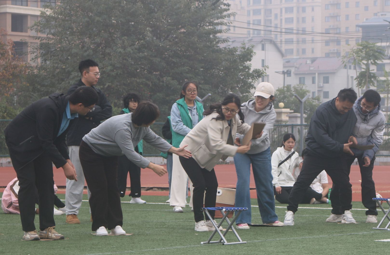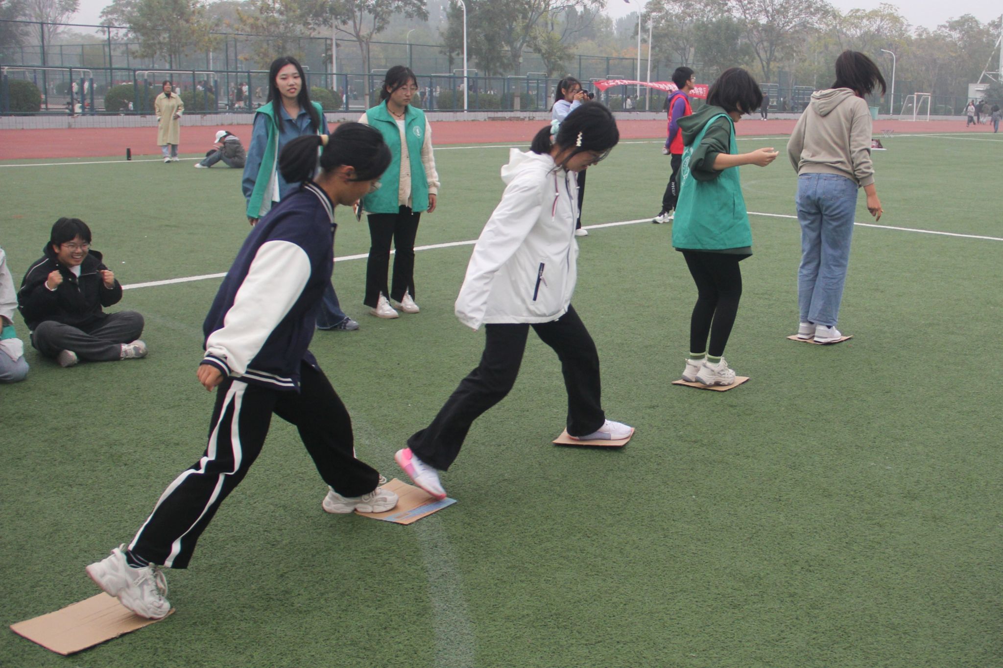 在教职工趣味运动会中,四人五足无疑是最具有欢乐氛围的项目之一。随着一声清脆的哨响,比赛正式拉开帷幕。平日里沉稳庄重的教师们瞬间变身成为赛场上活力四射的运动员。“一二、一二……”整齐的口号声在操场上空回荡,教师们的身体微微前倾,手臂紧紧地搭在彼此的肩上,每一步都迈得坚定有力,每个人的脸上都洋溢着兴奋的神情。足球传递活动中,教师们身姿矫健、配合默契,通过一个眼神、一个手势的默契交流,巧妙地控制着足球的方向。旁边的观众也被他们的激情所感染,不断为他们呐喊助威,气氛热烈而欢快。