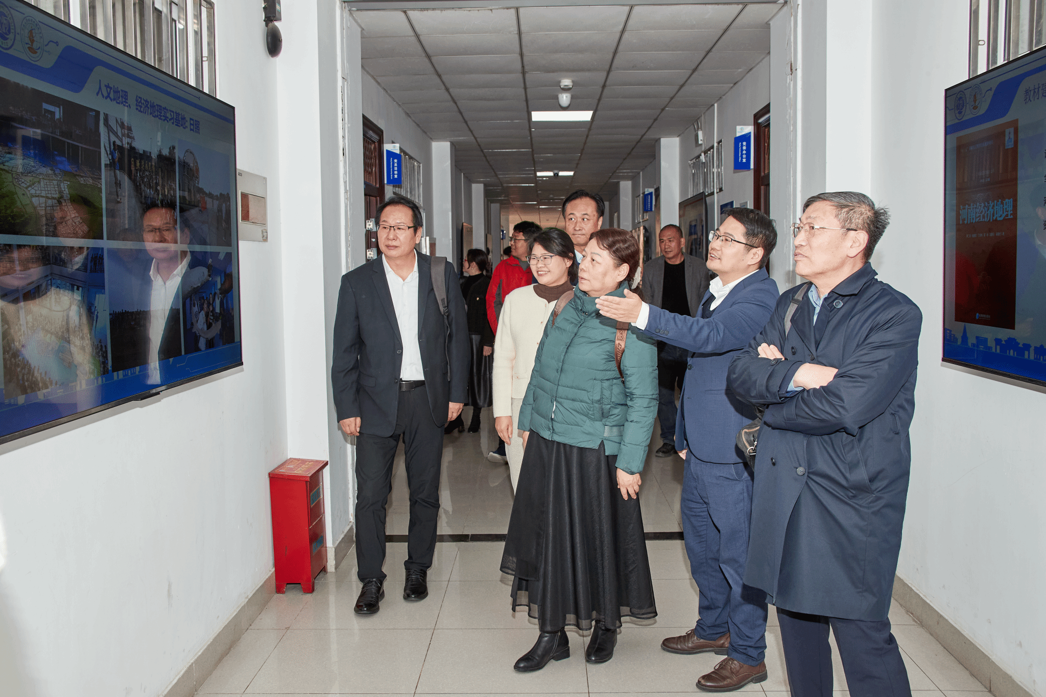 秦奋教授、王海鹰副教授的带领下,一行人参观了东英博物馆和地理学智慧教学平台。期间,秦奋和王海鹰向大家详细讲解了学部虚拟仿真技术服务黄河国家战略的应用情况。