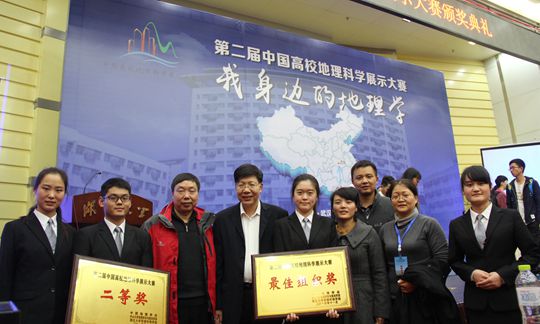 11月19日,以“我身边的地理学”为主题的第二届中国高校地理科学展示大赛决赛在湖北大学举行,我院代表队与中山大学、武汉大学、兰州大学、中国地质大学等全国四十所高校代表队进行角逐,最终以第三名的成绩荣获本届大赛人文地理组二等奖,并荣获最具学术主题奖、最具创新主题奖及最佳组织奖。