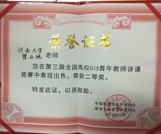 全国高校GIS青年教师讲课竞赛两年一度,由教育部高等学校地理科学教学指导委员会和中国地理信息产业协会教育与科普工作委员会主办。大赛旨在面向未来,培养GIS教育人才、规范GIS教育体系,提高教学质量和专业技能人才培养水平。环境与规划学院一直注重教学改革,强化实践教学环节,重视青年教师教学能力培养工作。翟石艳老师在此次竞赛中喜获佳绩,充分肯定了我院师生的在GIS学科建设方面的成绩,是我院对于青年教师教学能力重视和培养成果的集中体现。
