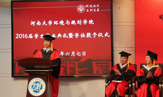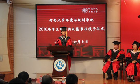 毕业生屈文笛代表全体2016届本科毕业生向学校、学院和各位老师表达衷心的感谢,她在演讲中重温大学四年的点点滴滴,感谢老师们的辛勤栽培,一定会谨记老师们的谆谆教诲,成为河大精神财富和优良传统的继承者与传递者。2013级孙伟国作为在校生代表为学长学姐们送上祝福,感谢他们无微不至的关怀和细心指导,祝愿他们早日实现自己的人生理想,在新的道路上一帆风顺、前程似锦。