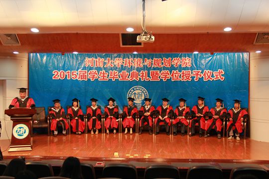 关于授予2015届普通本科毕业生学士学位的决定》。院长秦耀辰为241名毕业生正冠拨苏,颁发学位证书,并一一合影留念。