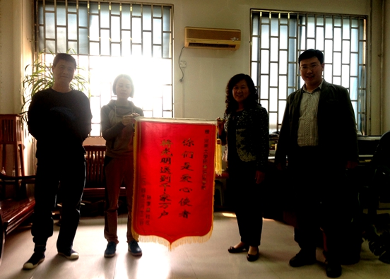 4月8日下午,开封市孙李唐社区负责人代表来到环境与规划学院,为我院赠送锦旗,内容为“你们是爱心使者,将光明送到千家万户”,以感谢和表彰我院学子的志愿行为。参加本次赠旗仪式的有北郊乡团委书记,孙李唐社区代表葛丹丹,小说狂人