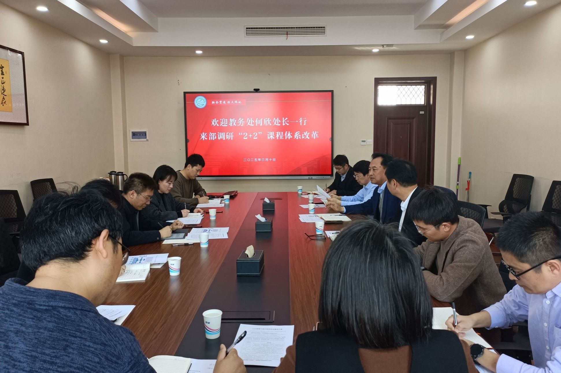 会议伊始,丁志伟对教务处一行的到来表示热烈欢迎,并对教务处一如既往的关心和支持表示感谢。之后,他重点解读了学校“2+2”课程体系改革的理念和重点,从“通”“专”两个维度介绍了学校的实践性改革动向和应用性创新人才培养方向。随后,何欣详细介绍了教务处课程体系改革的背景、内涵和目标,提出了各院系在新时代育人体系下的课程优化内容,以培养具有创新精神和实践能力的高素质人才。
