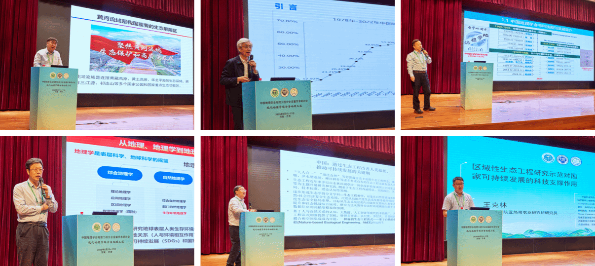 在大会主旨报告I阶段,傅伯杰院士作《黄河流域人地系统耦合机制与模拟》报告,分析黄河流域水资源短缺、水沙关系变化等挑战,划分人水关系阶段并揭示人类活动对径流与泥沙的影响,提出了优化用水结构、促进人地系统协调等重要方向;陈发虎院士作《青藏高原多圈层相互作用与人类适应》报告,指出了创新完善地理科学体系和地球系统科学研究的前沿方向,深入解析了高原板块运动、季风系统重塑及人类适应特征,强调关注全球变暖对高原生态和可持续发展的影响;郭仁忠院士作《城乡空间治理与区域协调发展》报告,指出城市化空间失衡问题,建议构建多尺度空间治理体系以实现城乡高质量发展。在大会主旨报告II阶段,刘彦随教授阐释了现代地理科学与工程耦合原理,分享了兰考盐碱地综合治理的地理工程技术示范与学科体系构建思路;王克林研究员阐述喀斯特石漠化治理的 “粮草畜一体化” 模式及土壤酶活化技术应用;张扬建研究员介绍藏北高寒草甸生态系统观测成果与模型构建设想;何书金研究员说明地理学期刊集群发展现状与国际化规划;康跃虎研究员展示微灌技术破解盐碱地治理难题的理论与实践成效,多维度展现地理学科的研究进展与应用前景;乔家君教授作了介绍了河南省地理工程实践和小说狂人