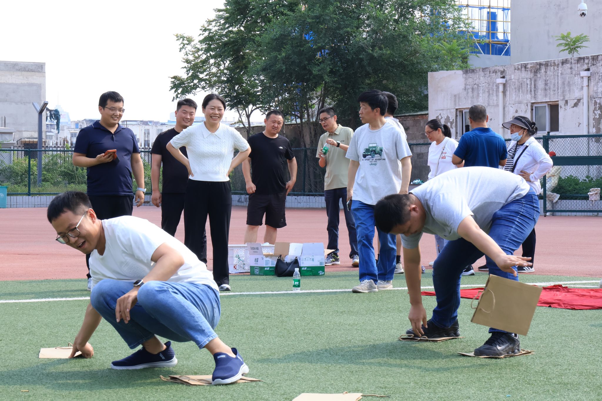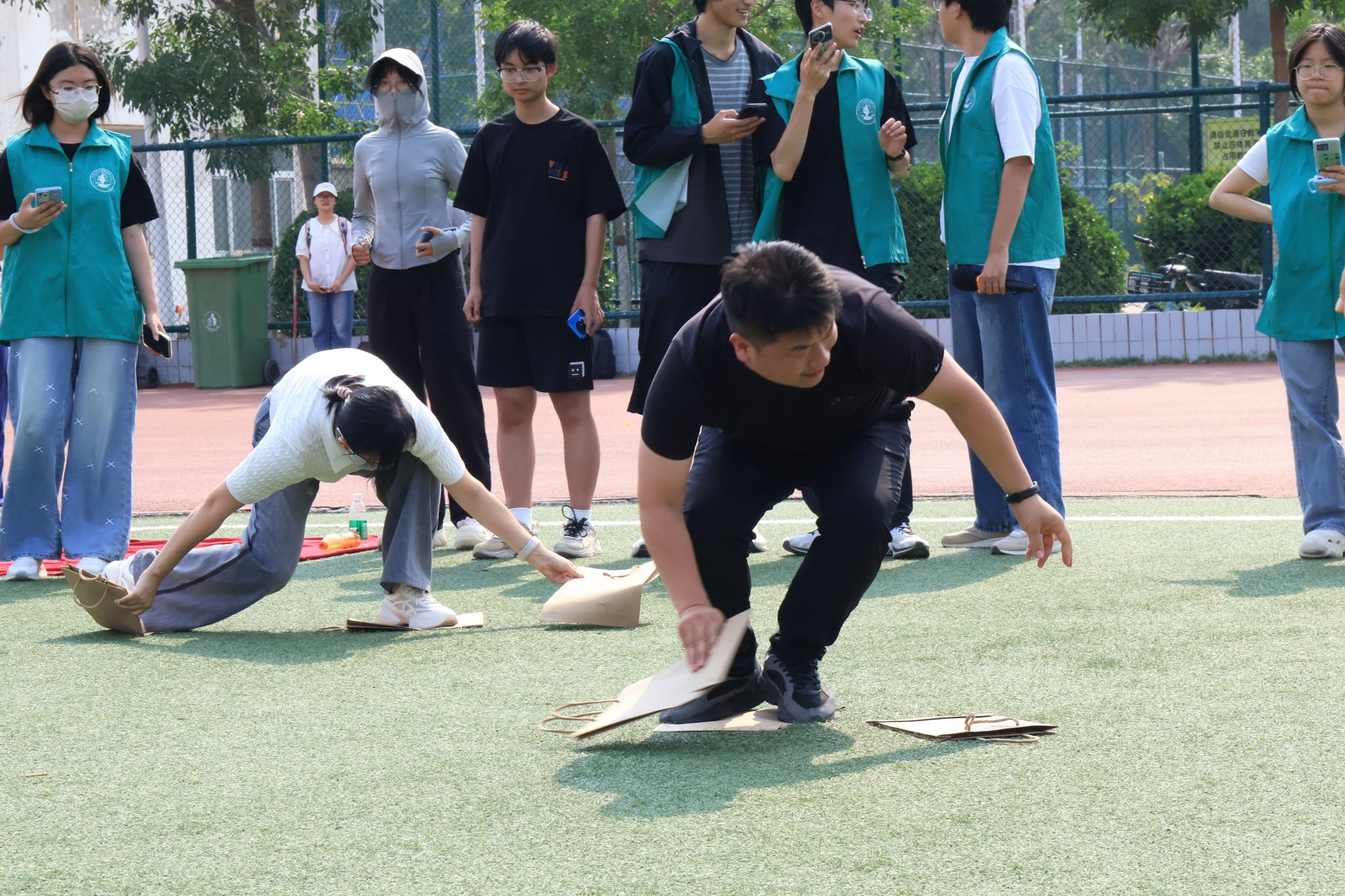 首个比赛项目是“抓塑料袋”,随着裁判一声令下,教师们迅速进入状态,配合默契,动作敏捷,全力以赴争取最佳名次。在“抓住或跑开”项目中,他们反应迅速,策略得当,成功接住沙包与躲避攻击,赢得了场外观众的阵阵欢呼。“一人三板走”项目则更加注重团队协作,各工会小组六人分为一组,接力完成挑战,展现出了出色的平衡能力和协调能力。场外观众的热情被他们的精彩表现所点燃,纷纷为他们加油助威,现场气氛热烈非凡,欢声笑语不断。在“盲眼套圈”项目中,各工会成员被戴上眼罩并在原地旋转五圈,教师们需要依靠自己的直觉和方向感将手中的套圈准确地投向物品区域。整个活动过程中,他们不仅展示了出色的竞技水平,更彰显了团队协作的魅力。最终,“地信”工会小组凭借出色的表现荣获本次趣味运动会第一名。