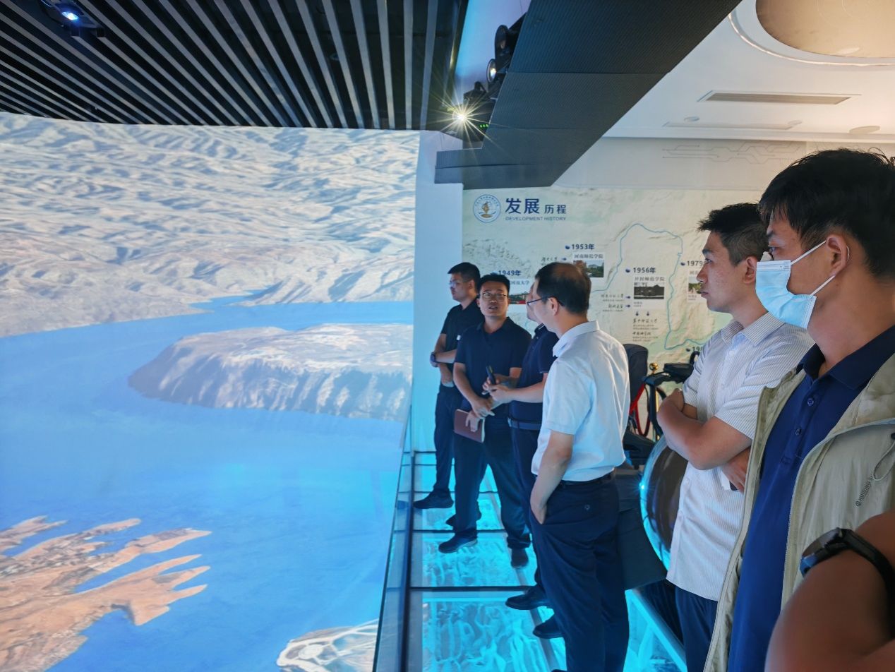 第二个阶段为实验室参观与交流。首先,王海鹰带领罗庆一行参观了地学楼一流虚拟仿真实验室,介绍了实验室在裸眼3D、水利工程仿真系统、黄河流域数字技术支撑国家战略等方面建设成效。之后,丁志伟带领他们参观了学部黄河流域环境变化与人类适应研究院,介绍了研究院在气候环境变化、生态治理、资源利用、环境保护及人类适应等方面的研究成果。最后走入东英自然博物馆,丁志伟介绍了学部在虚拟嵩山、虚拟黄河、虚拟开封、虚拟清明上河园、虚拟校园等方面的课程开发情况,现场操作演示了小说狂人