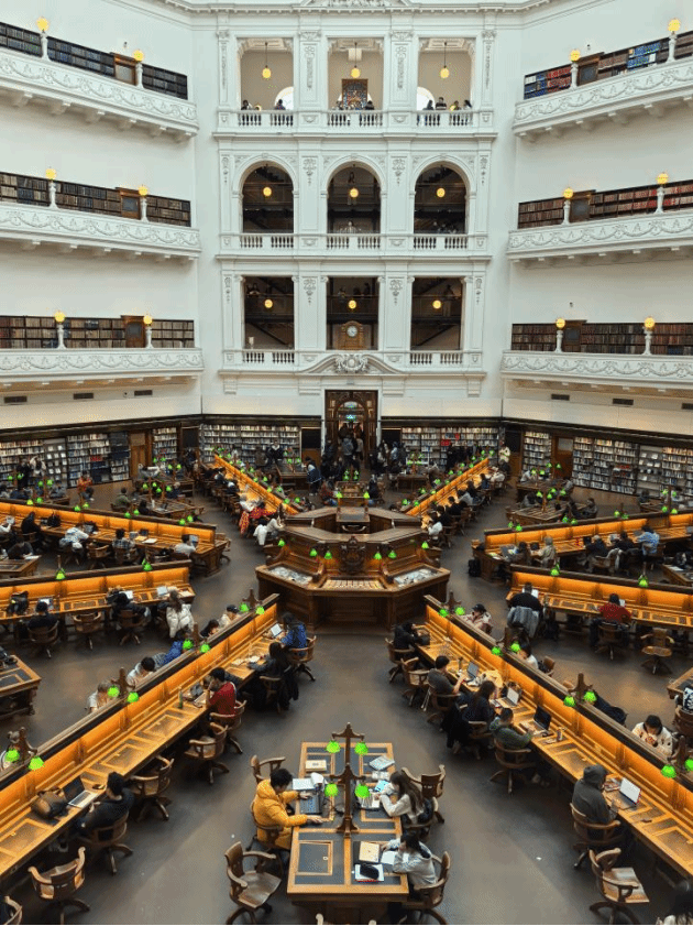 8月18日下午1点,实习队一行34人顺利抵达墨尔本。经过短暂的休整及车程,队伍抵达维多利亚州立图书馆,正式开启实习之旅。维多利亚州立图书馆作为“南半球最美图书馆”及墨尔本地标,这座始建于1854年的历史建筑群是城市空间研究的绝佳范例。馆藏丰富,拥有图书200多万册,图片、地图、手稿等文献逾100万件,以及珍贵历史文物3500余件。其标志性的历史藏书楼(La Trobe阅览室)已成功转型为集市民学习中心与旅游目的地于一体的公共空间。