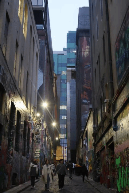 最后,师生一行来到墨尔本最有代表性的街头艺术“画廊”——霍希尔巷(Hosier Lane), 涂鸦与老旧高大的楼房、石质路面等城市元素融为一体,形成独特的艺术景观,百年石板路与现代艺术的碰撞,浓缩了墨尔本的城市文化缩影。