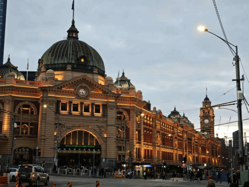 结束室内文化场馆参观,师生一行踏上Citywalk旅程,细致观察城市街道布局、建筑特色与街区文化。弗林德斯火车站是游览墨尔本最佳的起点,在火车站的百里之内,咖啡馆、美术馆、电影院拱廊比邻,沿途古树参天成荫。该站始建于1901年,为文艺复兴风格建筑,主体呈米黄色,现为墨尔本地标性建筑之一。每当入夜,建筑外昏黄的灯光点亮时,弗林德斯车站就展现出维多利亚建筑古典华丽的壮观风貌。