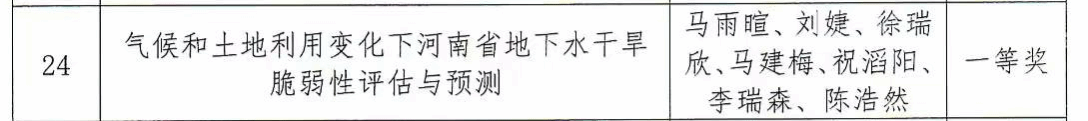团队凭借作品《气候与土地利用变化下河南省地下水干旱脆弱性评估与预测》,在比赛的严格评审与激烈角逐中脱颖而出,荣获省级一等奖。