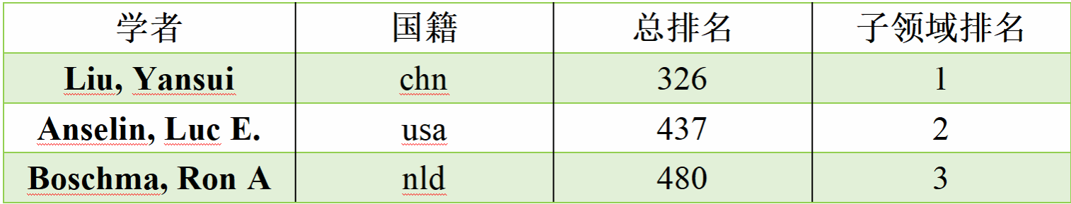 学术副校长、地理科学与工程学部主任刘彦随教授在全球地理学者中排名第一;美国芝加哥大学空间数据科学中心的Luc E. Anselin教授(空间计量经济学代表人物)和荷兰乌得勒支大学的Ron A. Boschma教授(演化经济地理学代表人物)分列二、三位。