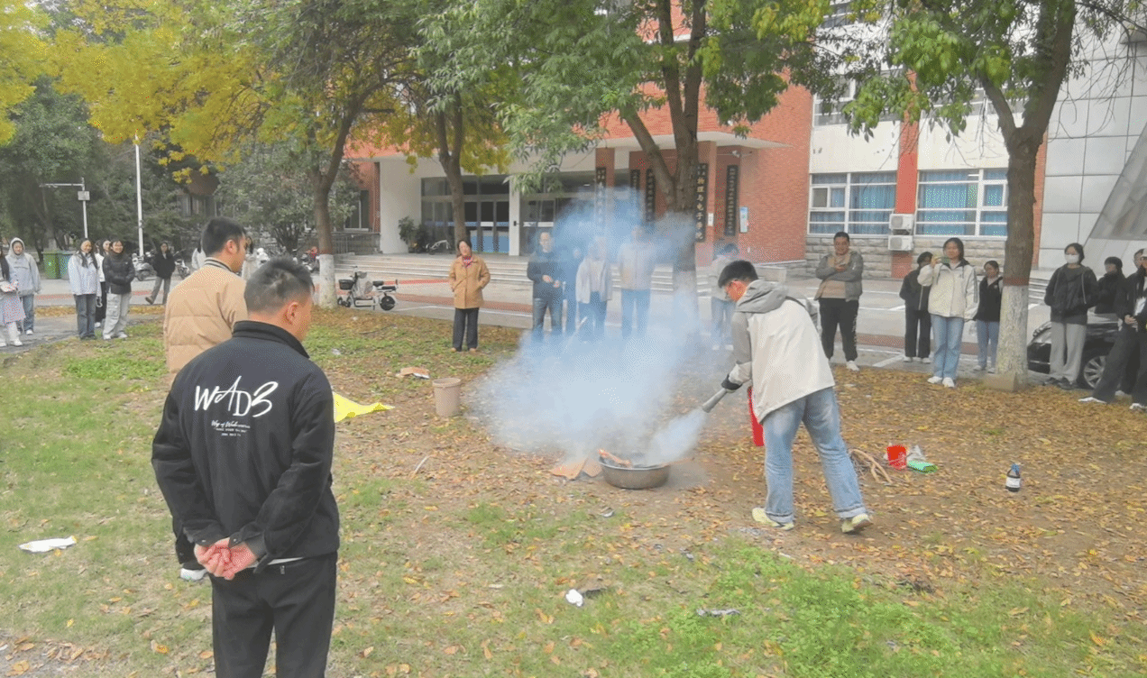 此次演练地点为景兰苑和地学楼6楼,各环节分工明确、衔接有序。在景兰苑演练现场,李天奇老师布设两个实际火源,模拟真实场景,监控演练过程。生态地理实验室的卢二超老师率先开展个人防护演示。他详细讲解护目镜防飞溅、消防面罩防窒息的佩戴要领,纠正“系带过松”“面罩贴合不严”等常见误区。之后,孟凡磊博士向同学们展示灭火毯与消防沙使用方法,通过模拟初期火情,手把手指导如何快速展开灭火毯覆盖火源、规范使用消防沙阻隔燃烧,让大家在实操中理解不同灭火方式的适用场景。