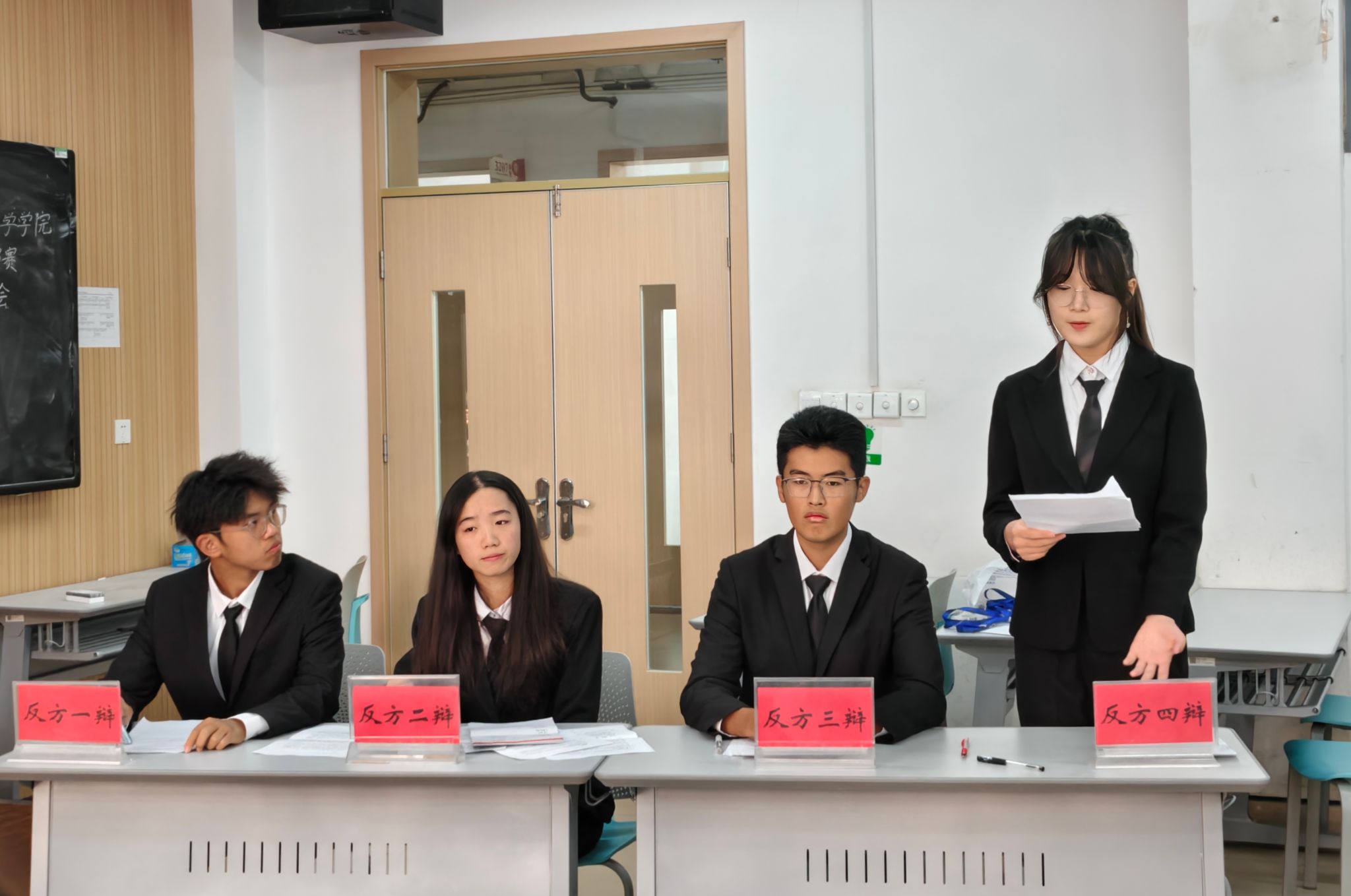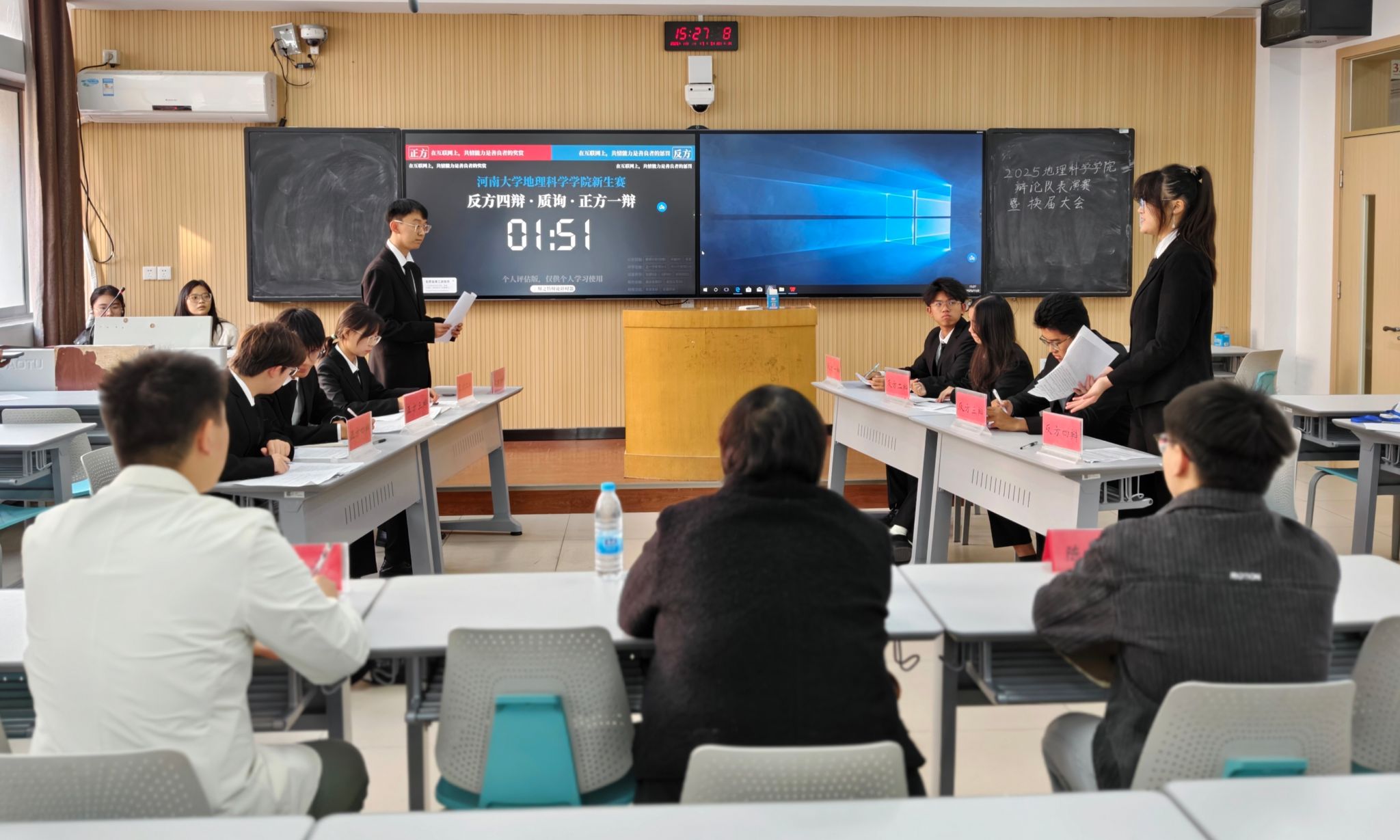 团委负责人冯文璐,2024届辩论队队长陈国玺、李皓文担任比赛评委。学院辩论队全体成员参加大会,会议由2025级本科生马昊远主持。