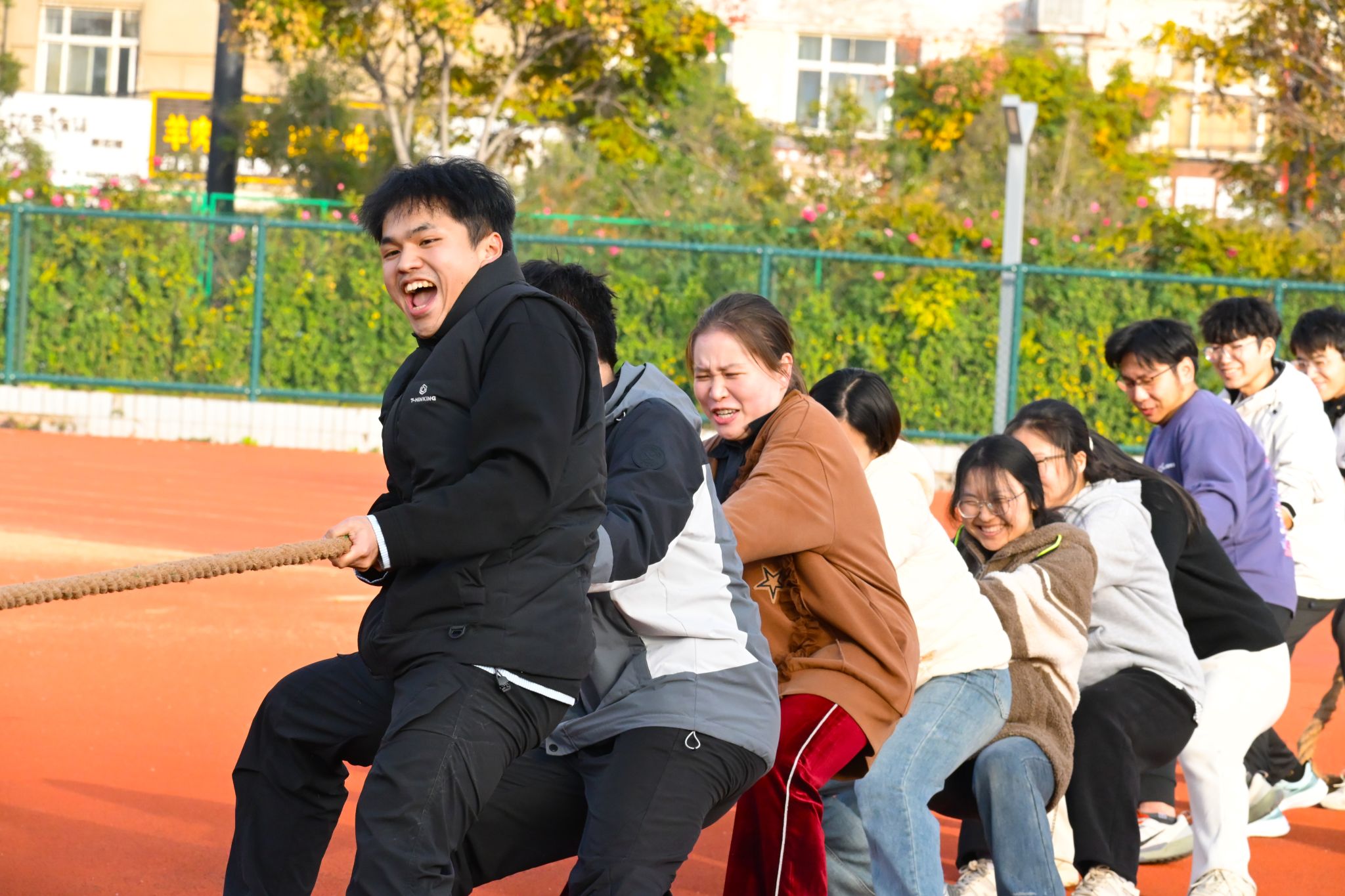 运动场上,赛事精彩纷呈、活力涌动。男子1000米比赛率先鸣枪,参赛运动员沉住气调整呼吸,迈着稳健的步伐往前冲;女子仰卧起坐赛场同样热血沸腾,选手们拼尽全力、咬牙坚持,在规定时间内奋勇突破自我。趣味项目更是夺人眼球,穿越呼啦圈时的默契协作、背对背传球中气球“脱逃”的欢乐瞬间,引得现场欢笑不断;五人六足赛里,选手们伴着“一二一”的整齐呼号,双臂紧扣、步调一致地飞速向前;最扣人心弦的当属拔河环节,选手们目光如鹰紧盯麻绳,双脚如钉扎根地面,场边助威声浪排山倒海,所有人都沉浸在这场充满激情与欢乐的运动盛宴之中。