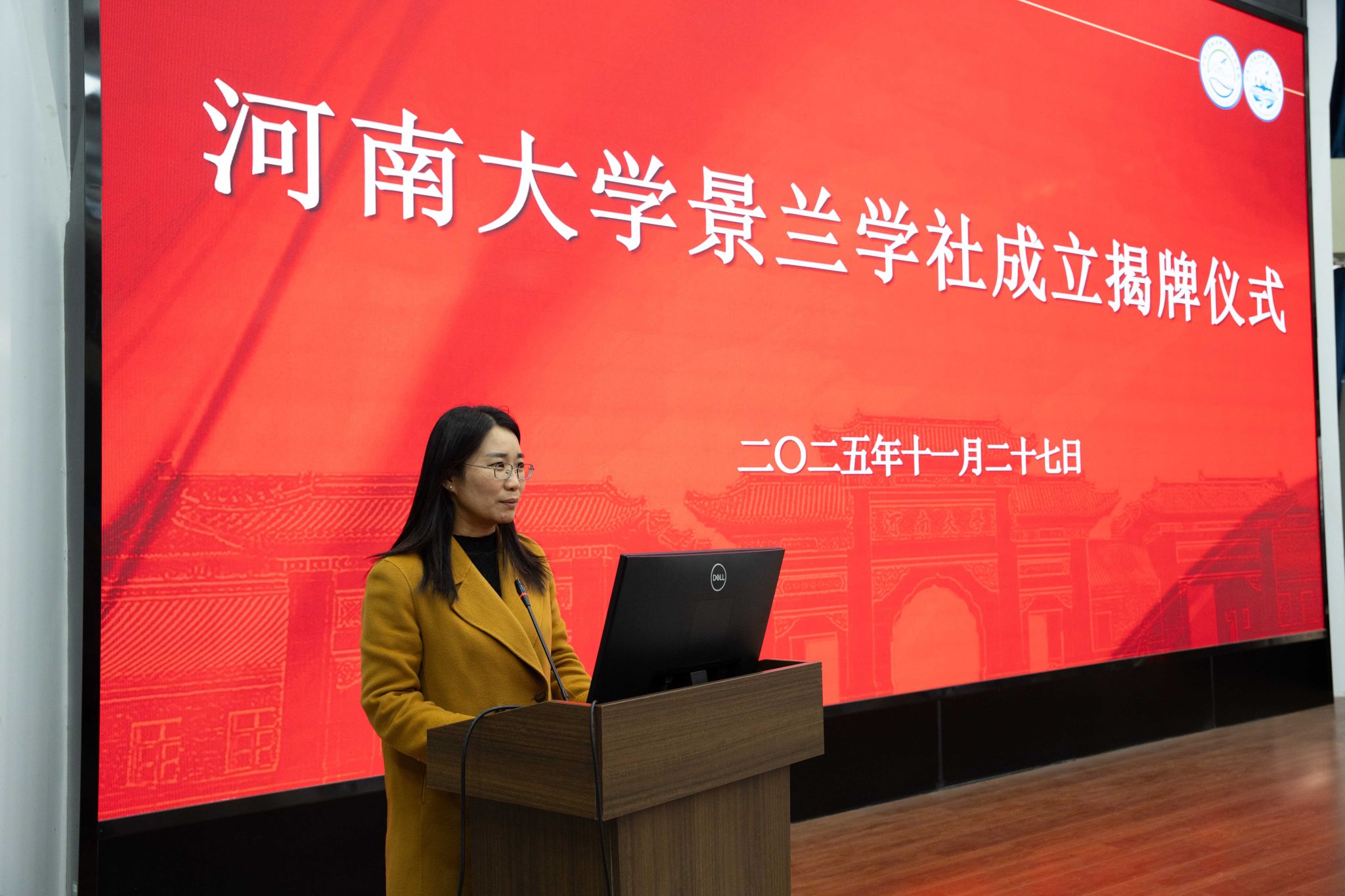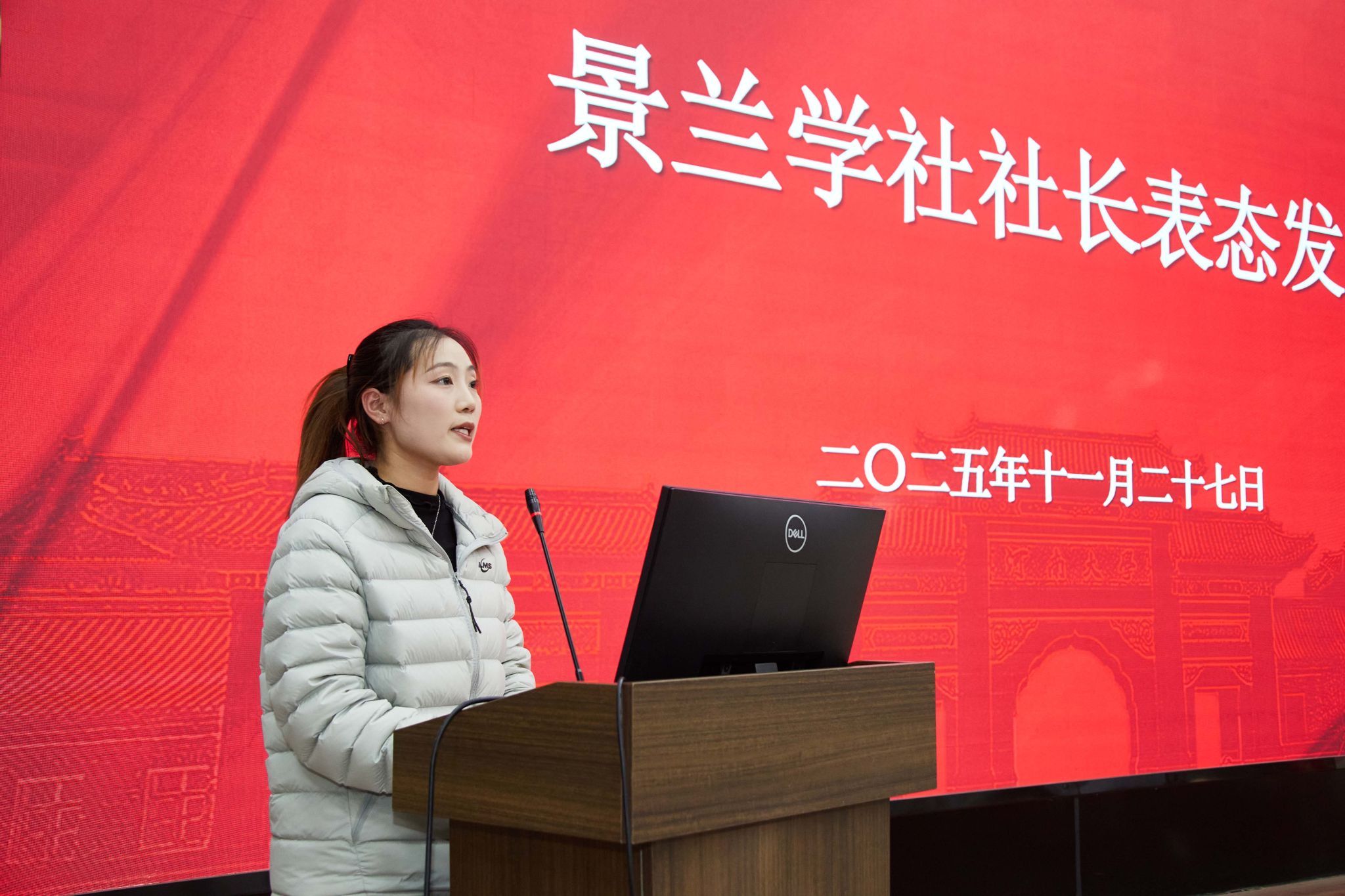 学社社长王梦琳在发言中表示,景兰学社以冯景兰先生之名命名,是责任,更是使命。她将带领和团结全体社员在学习中深化认识,在实践中锤炼能力,在传播中扩大影响,努力把景兰学社建设成为传承精神的高地、锻炼人才的平台、服务社会的桥梁。她号召全体社员挺膺担当,扎根中原大地,服务国家战略,成为新时代地学精神的坚定传递者。
