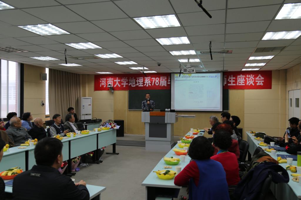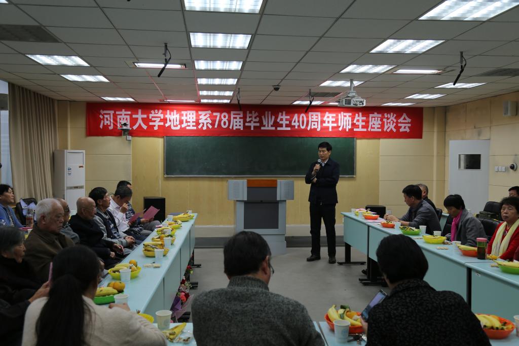 “你的教诲似凉爽的风轻拂我耳际,穿越人生的悲欢离合,老师我想你……。”上午十时许,在校友们动情的歌声中和花海里,校友座谈会正式拉开帷幕。首先,院长秦耀辰代表学院欢迎校友回家,并向地理系75级校友们毕业四十年来在全国各地取得的优秀成绩表示热烈祝贺,对校友们长期以来支持学院的建设与发展表示衷心感谢。随后他详细介绍了学院在学科建设、人才培养、师资队伍、科学研究、国际合作交流、实验室建设和实践教学等方面取得的丰硕成果。他指出,几十年来学院发生了翻天覆地的变化,逐渐形成了以黄河文明为文化特色、以黄河流域为地域特色、以地表圈层要素综合为科学特色、以空间信息集成为技术特色的学科专业建设模式,并一直致力于培养“铁塔品牌”地理优秀人才。校友们对学院发展取得的显著成效表示祝贺和兴奋,掌声连连。