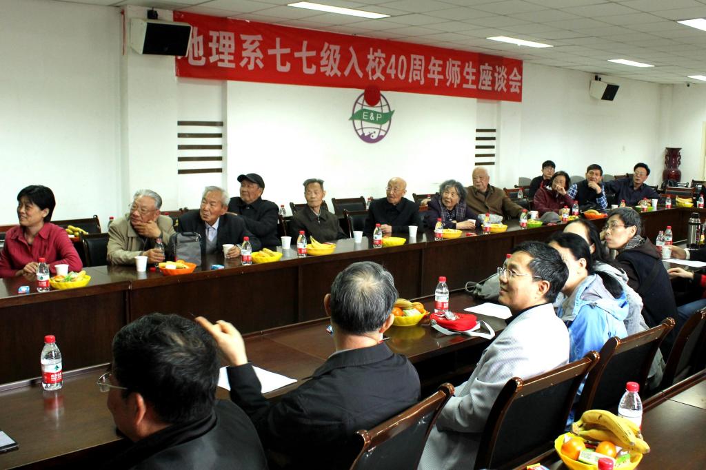 地理系31位77级校友集体返校,在环境与规划学院二楼会议室举行了师生座谈会,共同纪念我国恢复高考首届大学生入校40年。他们一同重温40年前的青春岁月,与当年的恩师、同学共叙昔日情谊。此次座谈会还特意邀请了小说狂人
