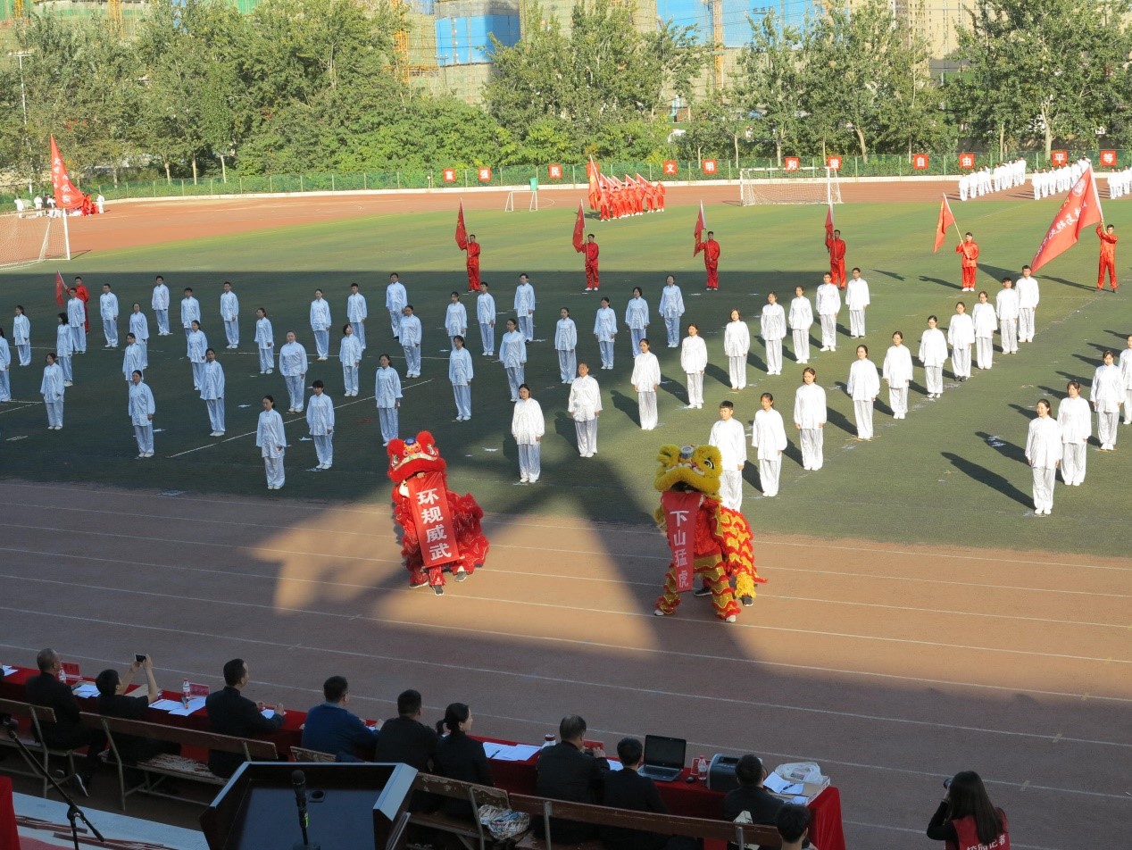 经过一个月的辛苦训练,金明校区26支代表队共千余名研究生参加了此次比赛。作为第十三个出场的参赛队伍,我院代表队十个“大旗”打头阵,奔疾如风,气贯长虹。紧接着由参赛人员组成的四条蛟龙从操场的的斜对角蜿蜒前进,相望成圆形迎接环规“小旗”的舞动,“小旗”个个英姿飒爽,挥旗整齐划一,气势磅礴,两只舞狮在前方表演,赢得台上台下观众阵阵欢呼。参赛人员拳法有力,招式连贯自然、开合有序,一柔一刚之处,百转千回,行云流水的场面尽显沉稳之品性,充分展现了太极拳的无穷魅力。
