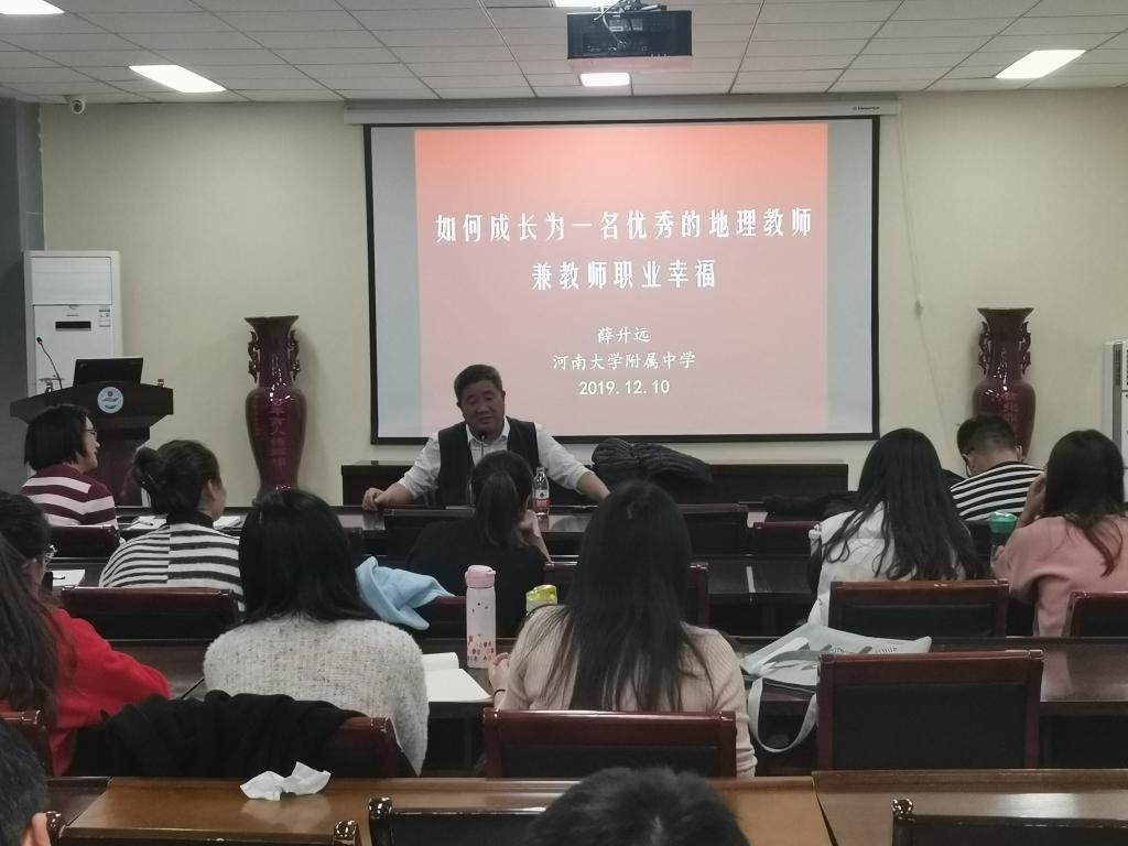 薛升远老师,自毕业以来坚守岗位32年,多次获得国家级、省级奖项。作为一名全国优秀的地理教育工作者,薛老师主要从做人、做一名合格的地理教师和一名优秀的班主任三个方面谈起。首先,薛老师以其切身体会教导我们要保持乐观的人生观,“人活于世,俯仰一世”,活着,便热爱生命,以积极乐观的心态面对生命中所遇到的各种困难;其次,作为一名地理教师,应该高标准的要求自己,练就地理教学基本功,夯实地理基础知识,拓展相关知识,不断学习,与时俱进,做学生学习的引路人,“学高为师,身正为范”;最后,做好一名班主任是每位同学应有的锻炼,我们要真心爱学生,诚心服务学生,关爱全体学生,以学生的发展需求为教学的出发点。 “听君一席话胜读十年书”,同学们受益匪浅,并就自己心中的困惑,跟薛老师进行了深入地交流,使我们在学业上、未来求职上又拓宽了思路,有了更清晰明确的方向以及自我定位。薛老师热情诚恳、诙谐幽默、风格独特,给在场的同学留下了深刻的印象。