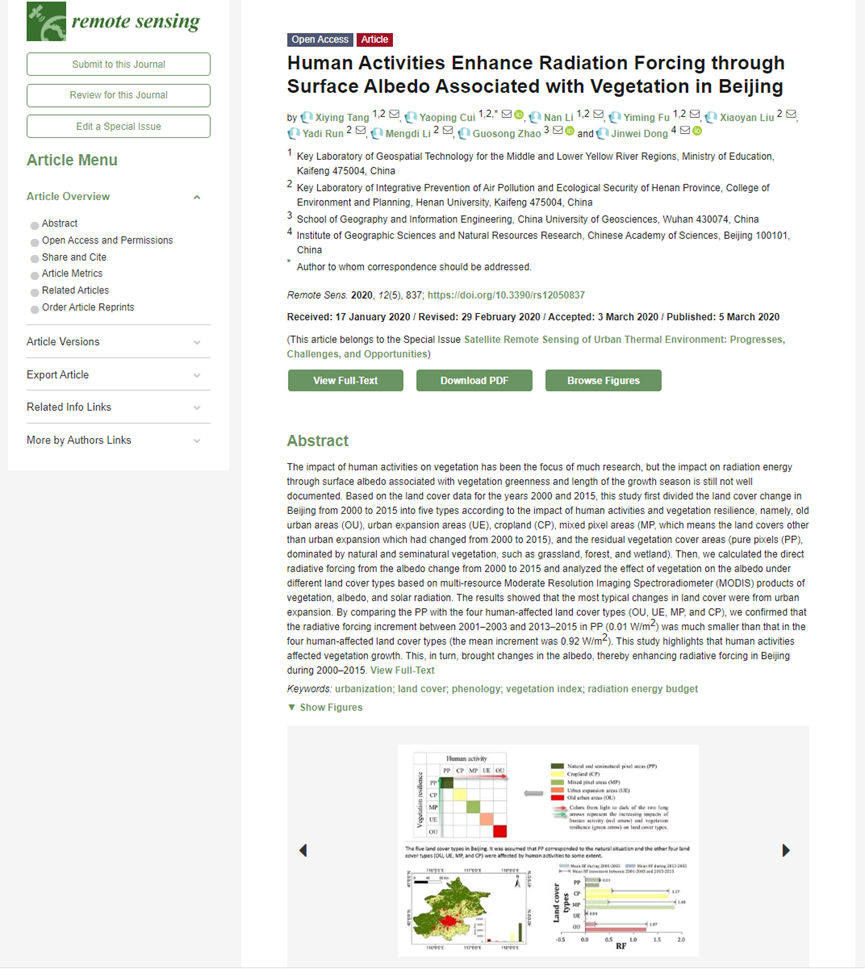 近日,我院2016级地理信息科学专业本科生唐希颖同学,在崔耀平教授的指导下,以第一作者在《Remote Sensing》发表了题目为:Human Activities Enhance Radiation Forcing through Surface Albedo Associated with Vegetation in Beijing的研究论文。