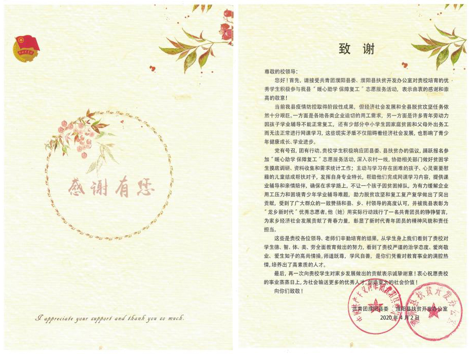 环境与规划学院2019级本科生孙赛赛心潮澎湃,一夜未眠——这个与因父母复工而缺乏辅导的孩子们结缘的男孩怎么也没想到,自己的一段志愿经历,竟得到了一份从家乡寄往大学的致谢信。信中,濮阳县政府用“‘龙乡新时代’优秀志愿者”来评价孙赛赛,并对其表示感谢。