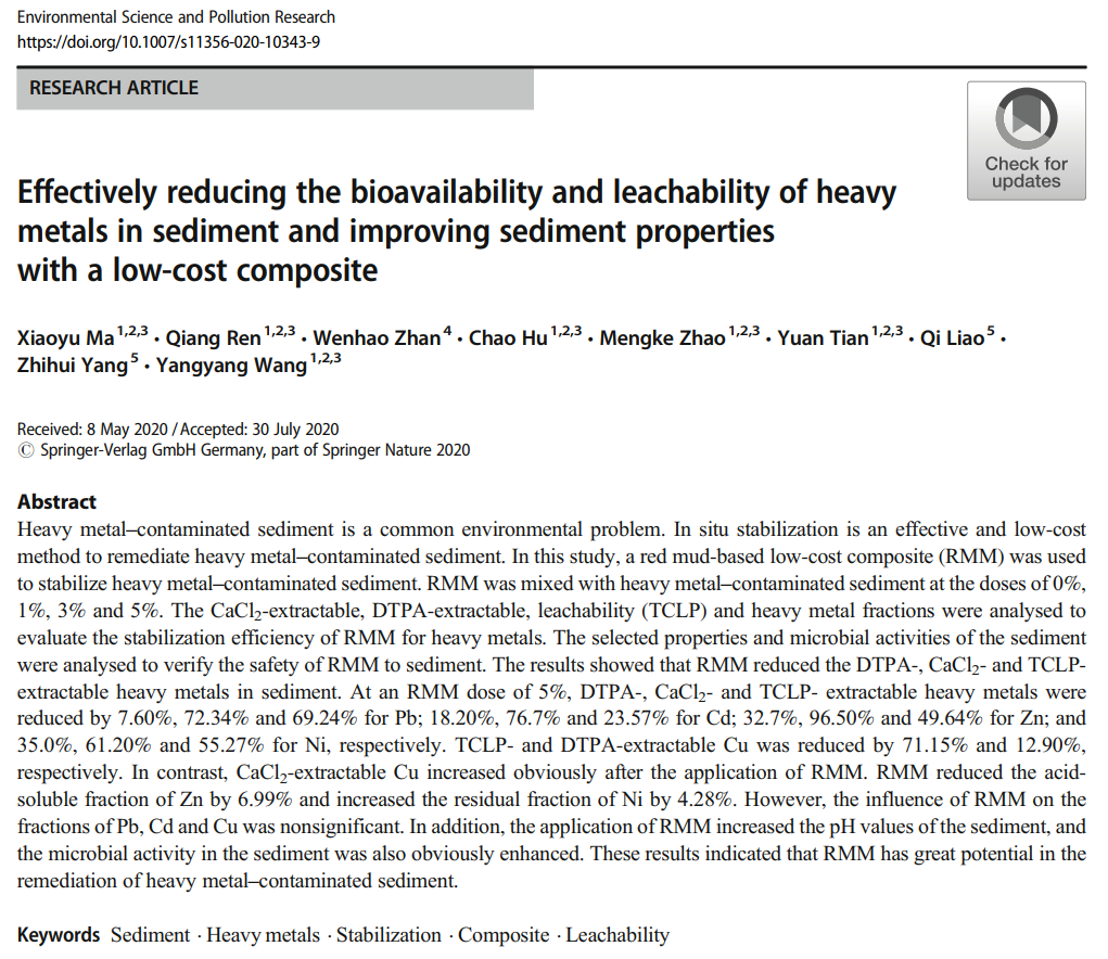 近日,我院2016级优秀毕业生环境科学专业本科生马晓宇在王洋洋副教授的指导下,以第一作者在《Environmental Science and Pollution Research》发表了题目为Effectively reducing the bioavailability and leachability of heavy metals in sediment and improving sediment properties with a low-cost composite的研究论文。