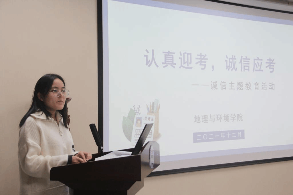 12月29日中午,地理与环境学院在地学楼二楼报告厅开展以“认真迎考,诚信应考”为主题的考前诚信教育。根据疫情防控要求,本次会议采用线上线下相结合的方式进行。我院党委副书记徐小军,团委书记、2019级辅导员赵越和本科生辅导员马利群出席会议,2019级、2020级和2021级全体本科生参加。会议由2021级辅导员屈利铭主持。