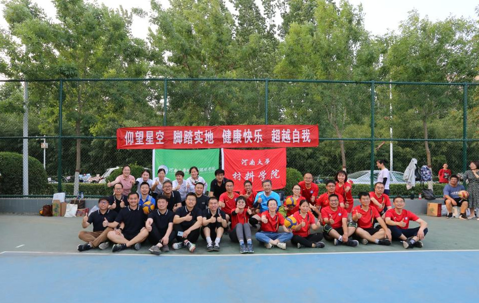 值得一提的是,排球场外,两院院旗并排而立,院旗上方的横幅是两个学院共同制定的宣传口号:“仰望星空 脚踏实地 健康快乐 超越自我”。赛前,两支队伍在横幅下合影,并一起热身,赛后,两队联合进行了复盘,比起以往,今天的赛场上少了些许紧张,处处洋溢着欢快和谐的氛围。副校长、地理与环境学院院长傅声雷教授与材料学院院长杜祖亮教授是小说狂人