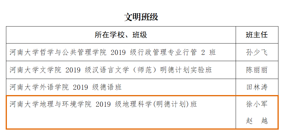 在2022年度河南省教育系统“两创两争”活动先进集体和先进个人评选活动中斩获佳绩,其中我院师生收获颇丰,由党委副书记徐小军和团委副书记、2019级辅导员赵越担任班主任的地理与环境学院2019级地理科学(明德计划)班荣获文明班级称号;由赵越指导的“绿色联盟协会”荣获文明社团称号。
