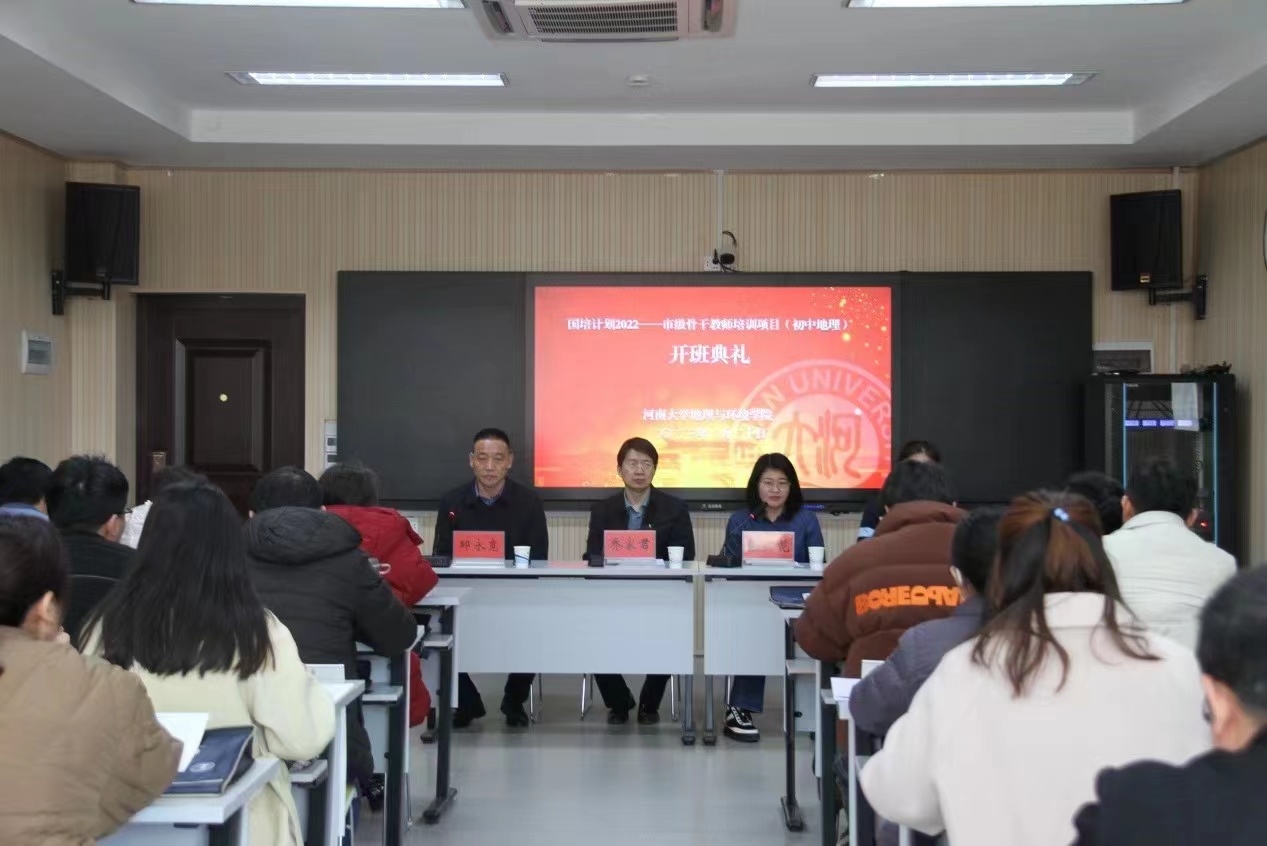 为促进河南省初中地理教师教学与教研能力提升, 2月20日上午,“国培计划 (2022)”—农村骨干教师能力提升培训项目—市级骨干教师能力提升(初中地理)培训班开班典礼在环境与规划国家级实验教学示范中心101教室召开。
