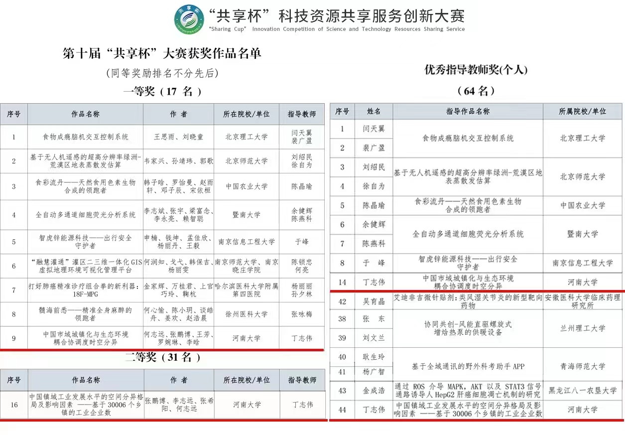 4月23-27日,以“共享科技资源,成就创新梦想”为主题的第十届“共享杯”大学生科技资源共享服务创新大赛获奖名单公布。我校地理与环境学院研究生何志远、张鹏博、王芳、罗婉琳、李晗五名同学组成的团队在全国3000余个参赛团队中脱颖而出,荣获全国一等奖,丁志伟老师荣获优秀指导教师。