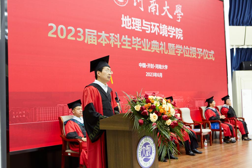 2023届本科毕业生代表金艺辰发言,对学校、学院、父母、师长表示诚挚的感谢。她说,回忆大学四年的成长,地理已成为她生命中的重要主题。但再多的言语也道不尽成长的收获,未来她会带着这些动人故事的风采,去开启新的人生篇章。在校生代表、2020级环境科学专业赵璟琦发言,向即将离开母校的学长学姐送上最衷心的祝愿并感谢他们在学习生活上的关心和指导。祝愿他们的未来前途光明,承载着老师的殷切希望奋力前行。轻装策马青云路,人生从此驭长风。