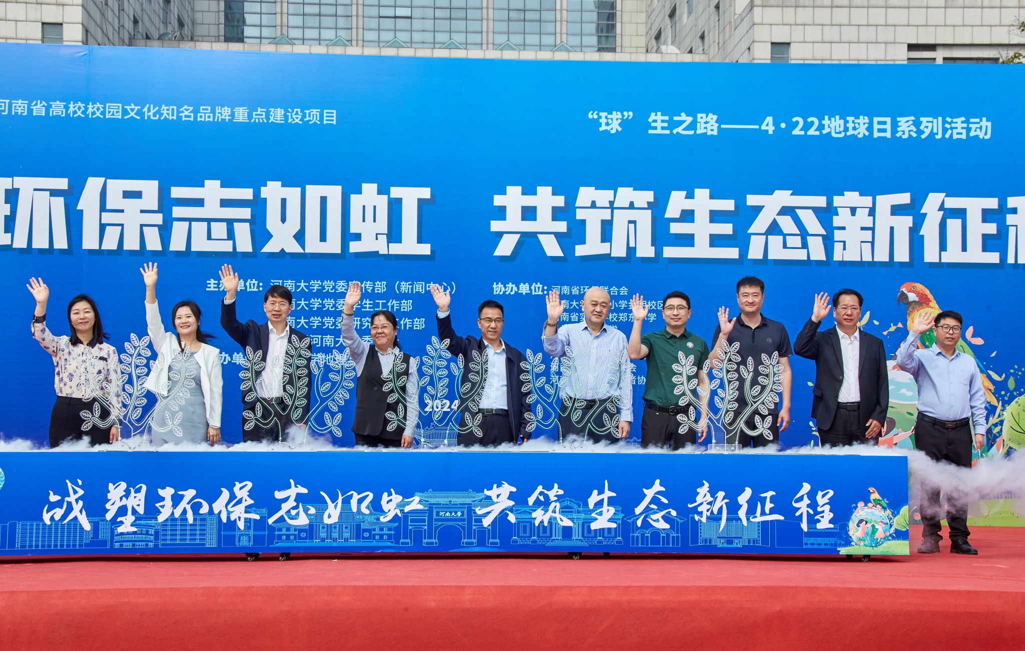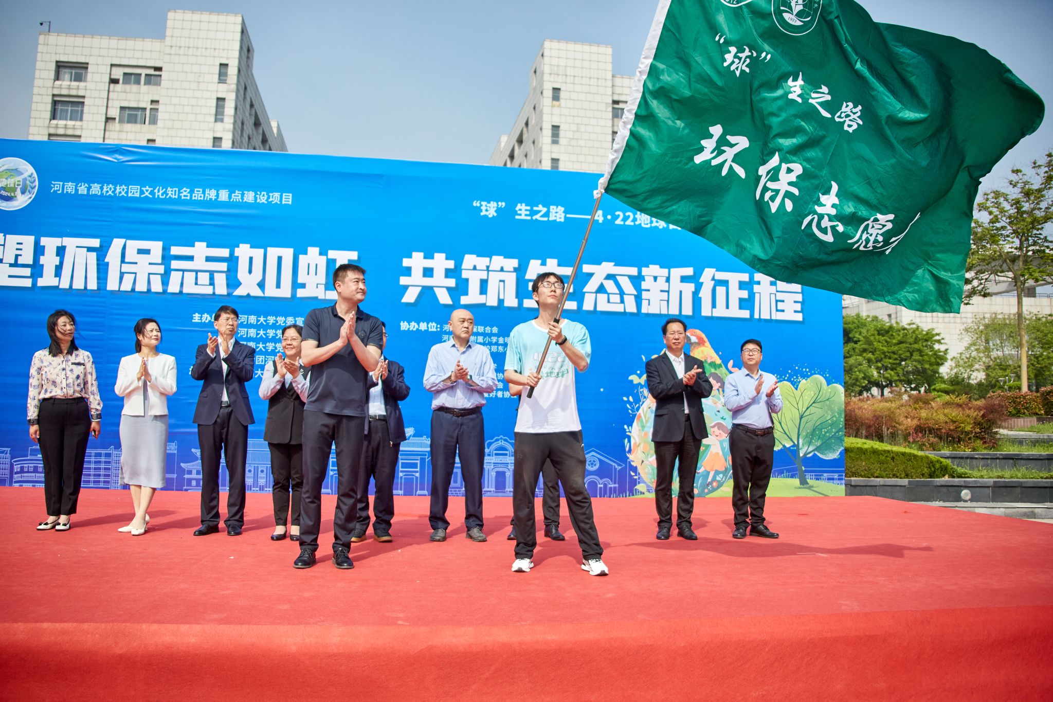 校团委副书记董文为环保志愿者授旗。主席台上的各位领导嘉宾携手为生态文明树浇水,“植”此青绿,共筑锦绣河山,同庆盛世中华。