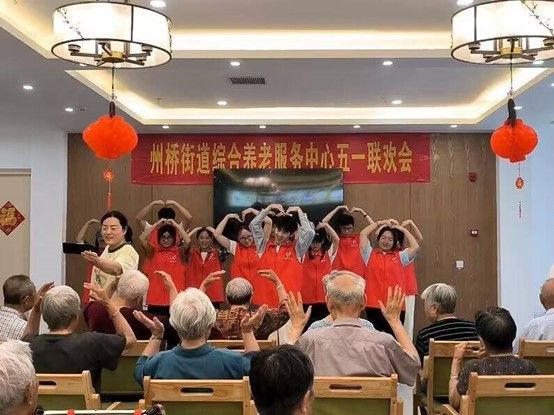 身穿红马甲的志愿者们在服务中心负责人的组织下,与在场爷爷奶奶们展开互动。老人们对志愿者的到来表示热烈欢迎。接着,志愿者们为爷爷奶奶们带来准备好的节目——舞蹈《最炫民族风》、手势舞《桃花朵朵开》、诗朗诵《青春中国》、歌曲《我和我的祖国》。在表演过程中,爷爷奶奶们与志愿者们一起跟着节奏挥手、鼓掌,整个活动现场洋溢着欢乐。