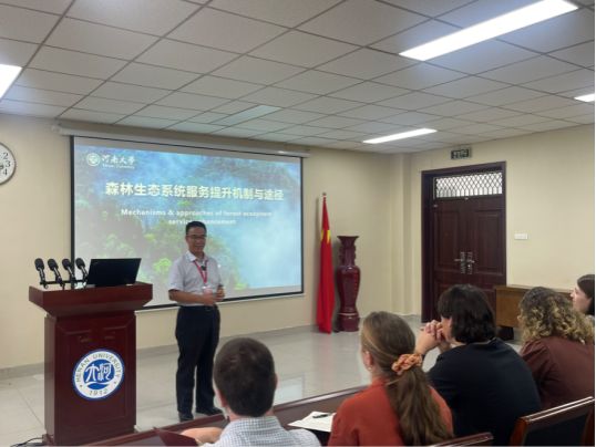 学术副校长、地理与环境学院院长、河南大别山森林生态系统国家野外科学观测研究站站长傅声雷教授进行了题为“森林经营管理及其生态系统服务提升”的精彩讲座。傅声雷不仅分享了他在生态地理学方面的丰富研究成果,而且深入探讨了森林生态系统在全球环境变化中的角色,还强调了森林经营管理的重要性,并展示了如何通过科学管理提升森林的生态系统服务功能的具体路径。最后,他通过多个实地研究案例,提出了退化生态系统的恢复模式构建与健康评价方法,解释了土壤生物的生态功能。期间,同学们踊跃发言,在与傅声雷教授的亲切交流中收获颇丰。