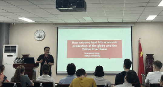 黄河文明与可持续发展研究中心副主任董冠鹏教授以“极端高温如何影响全球和黄河流域的经济生产”为题开展讲座。董冠鹏通过数据和实例分析相结合的方法,展示了极端高温事件对全球和黄河流域经济生产所造成的深远影响。董冠鹏通过详细解析高温对农业、工业及服务业的影响机制,提出了应对极端气候事件的策略。学生们对讲座内容积极思考与讨论,活动气氛异常活跃。
