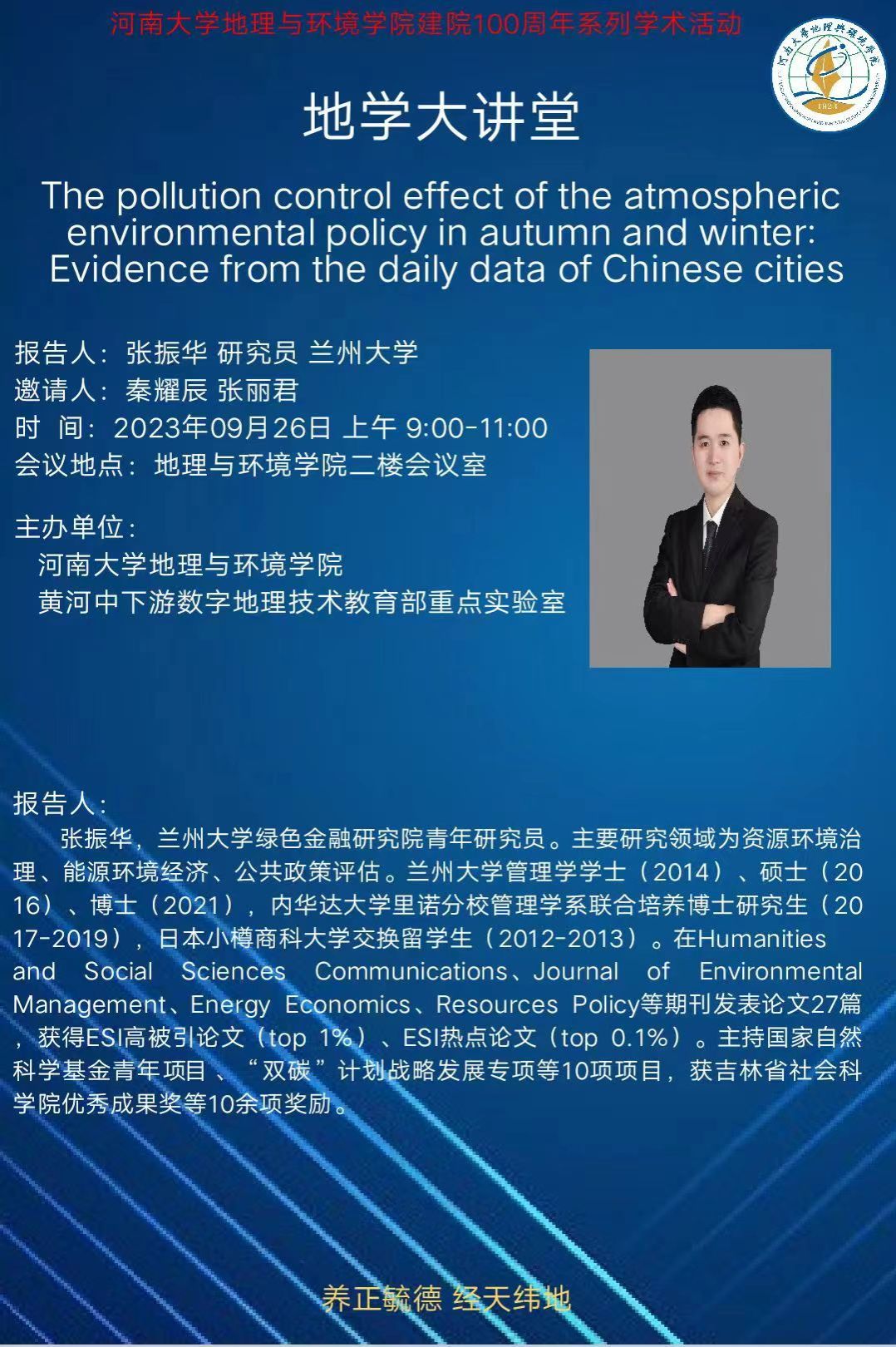 地学大讲堂 | The pollution control effect of the atmosphericenvironmental policy in autumn and winter: Evidence from the daily data of Chinese cities