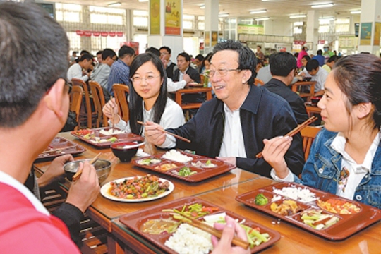 调研结束后,郭庚茂在北苑餐厅就餐时与我院2013级地理信息科学专业司晓娟、人文地理与城乡规划专业王德进等同学进行亲切交谈。