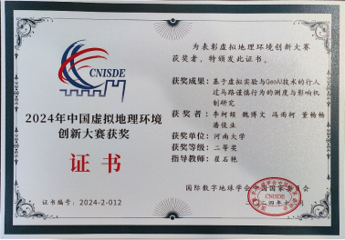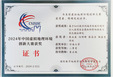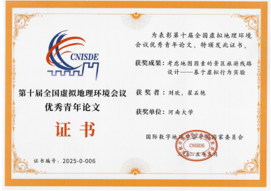 计算地理学实验室翟石艳教授带领课题组博士和硕士研究生积极参与,与同行专家和学者开展深入的交流和讨论,并汇报了团队的最新研究工作。博士研究生刘欢与翟石艳教授共同撰写的论文《考虑地图因素的景区旅游线路设计——基于虚拟行为实验》荣获优秀青年论文奖。李柯颉等硕士研究生提交的参赛作品《基于虚拟实验与GeoAI技术的行人过马路谨慎行为的测度与影响机制研究》以及张永豪等研究生提交的参赛作品《基于GeoAI技术的城市街道环境对行人夜间安全感知的影响测度与优化模拟研究》双双斩获2025年中国虚拟地理环境创新大赛二等奖。