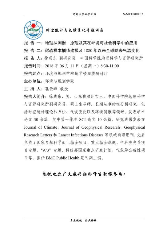 【地学论坛】时空统计与气候变化专题讲座 (时间:6.11,8:30-11:00)