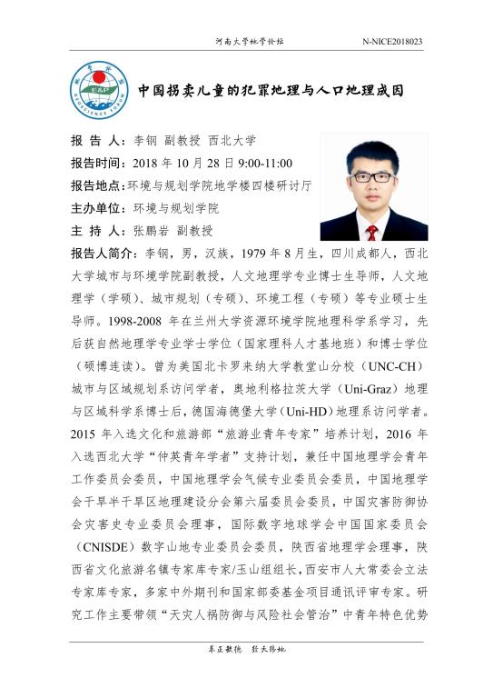 【地学论坛】李钢:中国拐卖儿童的犯罪地理与人口地理成因(时间:10.28(周日),9:00-11:00)