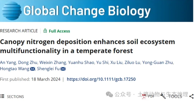 相关研究结果以“Canopy nitrogen deposition enhances soil ecosystem multifunctionality in a temperate forest”为题,发表于环境科学与生态学期刊Global Change Biology上。博士生杨安为论文第一作者,王洪涛副教授和傅声雷教授为论文的通讯作者,小说狂人