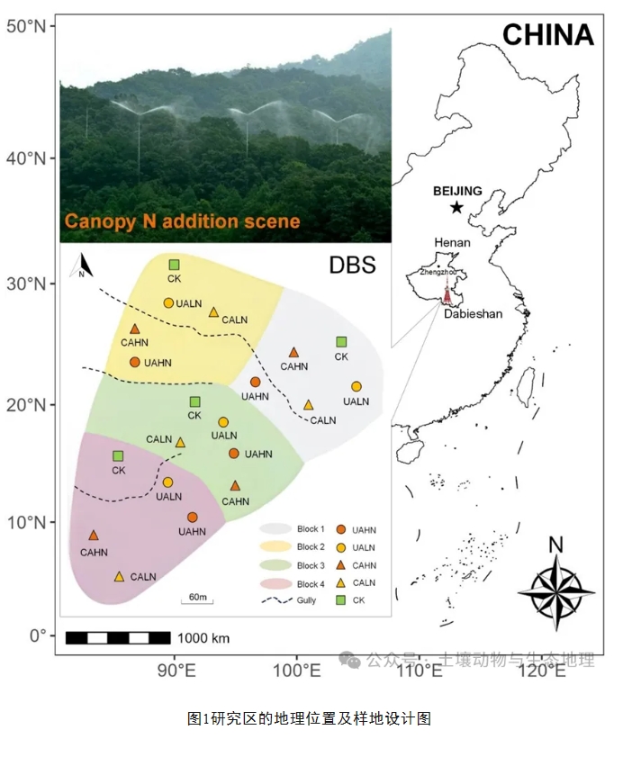 氮(N)沉降影响着对人类健康和福祉至关重要的生态系统功能。然而,对于这种情景下,森林土壤生态系统多功能性(SMF)的响应尚知之甚少。因此,研究团队依托位于河南大别山森林生态系统国家野外科学观测研究站的“林冠模拟N沉降”野外控制实验平台,通过在温带森林树冠上方和下方喷施硝酸铵溶液来模拟N沉降(图1)。