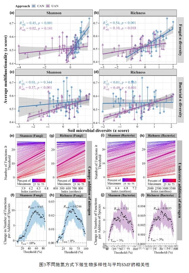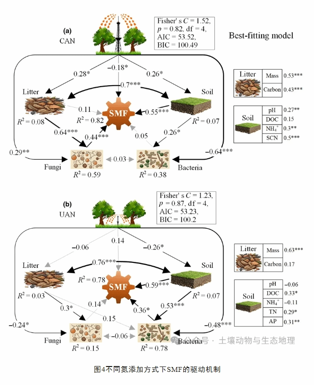 研究表明,林冠N添加促进了SMF,而林下N添加抑制了SMF(图2)。在林冠N添加处理中,SMF受真菌多样性调控,这主要是由于真菌对土壤酸化的强抗性和其自身高效资源利用特性(图3a-b和4a)。而在林下N添加处理中,SMF则受细菌多样性调控,这主要是由于细菌对干扰有着较强的恢复能力和其自身快速的周转能力(图3c-d和4b)。