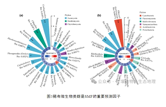 此外,稀有微生物类群可能在维持SMF方面发挥着重要的作用(图5)。这项研究首次提供了N沉降增强温带森林SMF的证据,并丰富了对增强的N沉降影响森林生态系统的认识。考虑到两种N添加方法的不同结果,林冠N添加对土壤微生物多样性-多功能性关系的创新视角对于制定保护土壤微生物多样性和在增强的N沉降背景下进行可持续生态系统管理的政策至关重要。