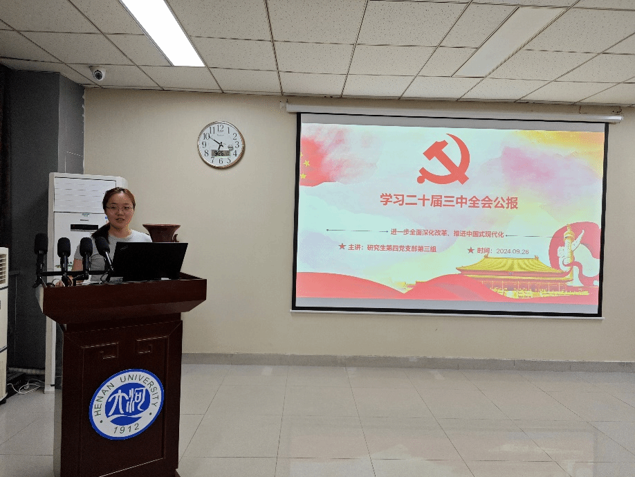 为深入学习贯彻党的二十届三中全会精神,9月26日,研究生第四党支部在学院楼二楼报告厅开展学习贯彻党的二十届三中全会精神党日活动,引领支部党员和积极分子深刻体会和感悟党中央的战略目标,践行“坚定不移听党话、矢志不渝跟党走”的行动指南。研究生第四党支部组织委员刘一凡主讲,支部全体党员与学习小组积极分子按时参加。