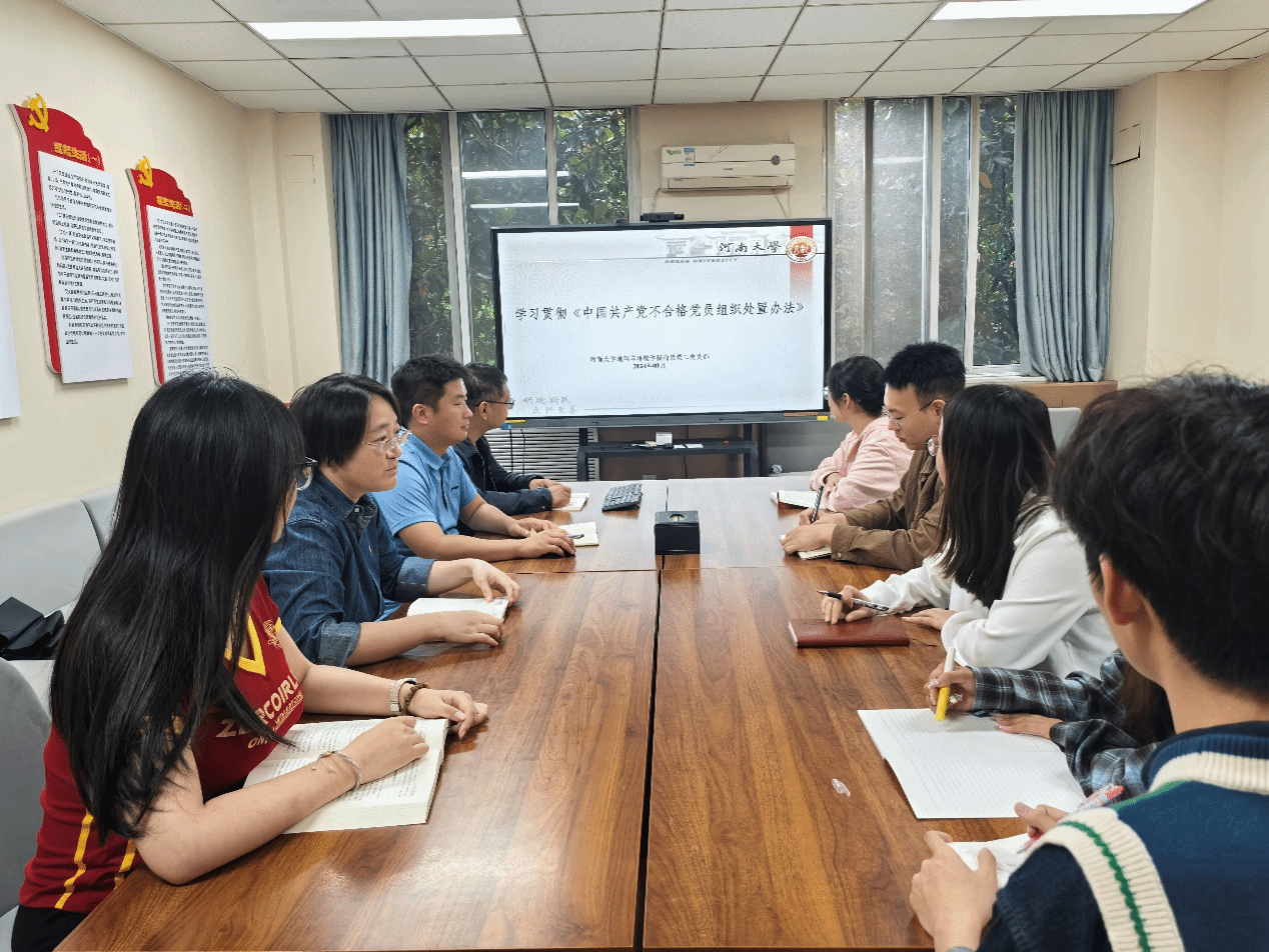 会议第二项:组织学习新印发的《中国共产党不合格党员组织处置办法》(以下简称《办法》) 。党支部书记谷蕾讲解了《办法》中的重点条文,并要求每位支部成员对照《办法》中列举的不合格党员表现,进行自我剖析和检查,查找自身存在的问题和不足,明确改进方向和措施。